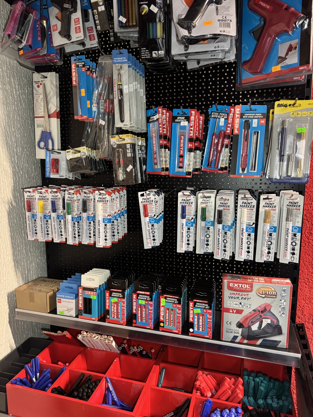 Pro dílny a hobby kutily nabízíme rozmanité nářadí a pomůcky, jako jsou fixy pro značení, tavné pistole pro rychlé lepení, reklamní přívěsky a další běžné dílenské potřeby.